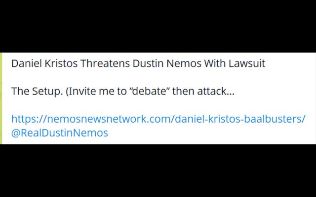 Baal Busters Daniel Kristos Threatens To Sue Dustin Nemos After Being Put On Pedophile List Alongside SGT Report Stew Peters Alex Jones.