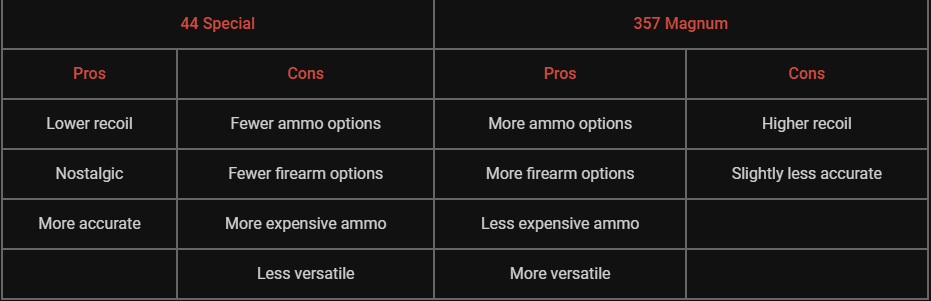 Even though the 44 Special is the larger cartridge, it has a lower recoil than the 357 Mag, which is very appealing to many shooters. However, aside from the nostalgia that accompanies the 44 Special, it doesn’t offer many benefits over the 357 Mag.