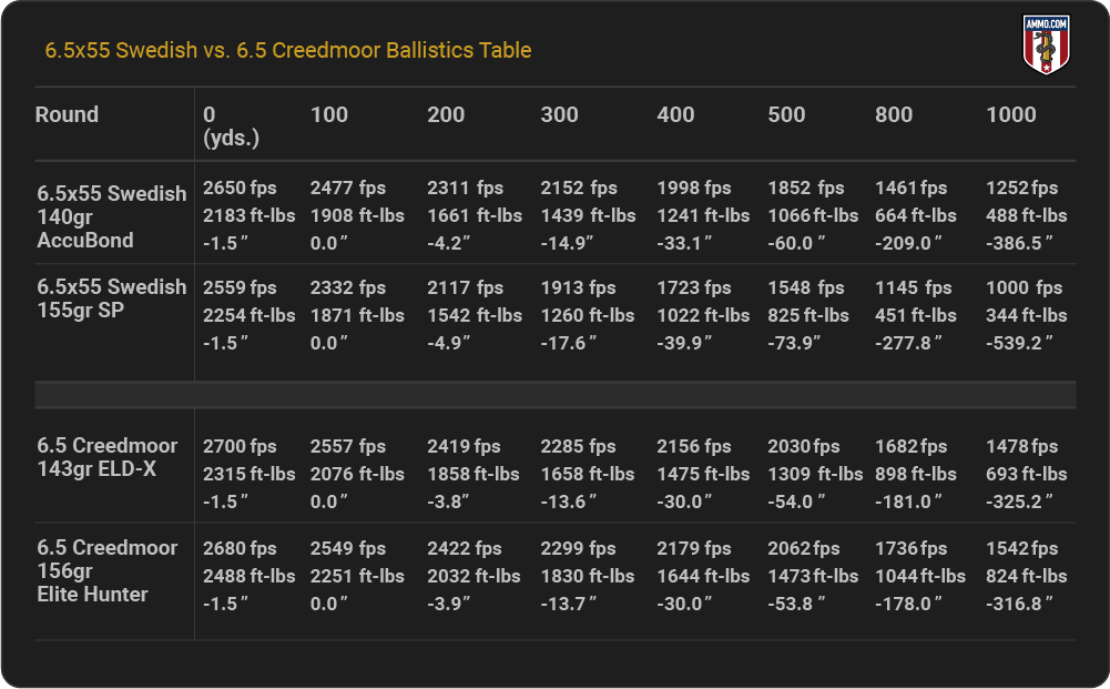 Looking at the 6.5 Swedish vs. 6.5 Creedmoor ballistic table above, we see some impressive numbers across the board for both rifle cartridges.