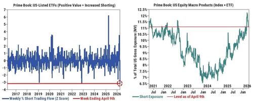 That pivot makes sense from a mechanics standpoint. Short exposure across U.S. macro products, index futures, and ETFs had climbed to the 93rd percentile over the past five years, with hedge fund gross exposure near an all-time high of 307%. When the Iran ceasefire headlines crossed, that positioning became a coiled spring. Shorts covered, hedges unwound, and global equities were net bought for the first time in eight weeks, with Goldman’s Equity Fundamental Long/Short Performance Estimate rising 4.01%, the best weekly reading since February 2021.