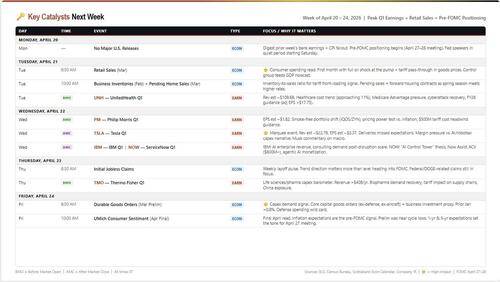 The calendar pivots from bank earnings to the consumer and Big Tech, with March Retail Sales, Tesla, and the final pre-FOMC sentiment read all compressed into five sessions. The April 27–28 FOMC meeting looms, with the Fed in its quiet period. That means every data point this week will be interpreted through the lens of what it means for rate policy under new Chair Kevin Warsh (assuming confirmation by then) or lame-duck Powell.
