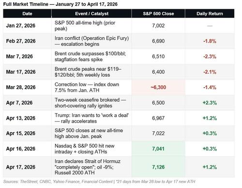 What began as a short-covering rally on April 7th has spent the last two weeks proving the bears wrong. Friday’s close at 7,126, the first finish above 7,100 in the index’s history, up 13.1% from the March lows, arrived alongside one of the most consequential single-session catalysts of the year. Iran declared the Strait of Hormuz “completely open.” Brent crude collapsed 9.1%. The Russell 2000 logged a new all-time high. The short-covering rally that skeptics said would exhaust itself in days has now run for three weeks and taken every major index to record territory.