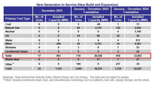 Despite this decrease, solar still led all other generation sources in 2025 installations. As of December, solar now makes up 12.2% of installed generating capacity in the U.S., according to FERC — trailing only natural gas, at 42.2%, and coal, at 14.3%.