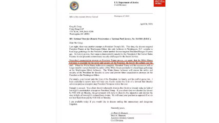 The same letter warns that a lawsuit blocking the project “puts the lives of the President… at grave risk” and demands it be dropped immediately.